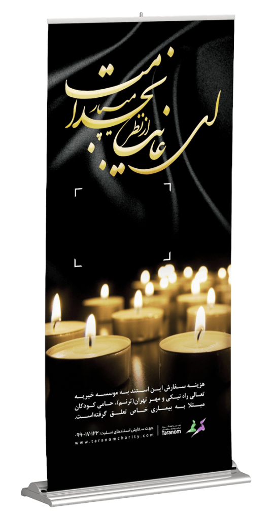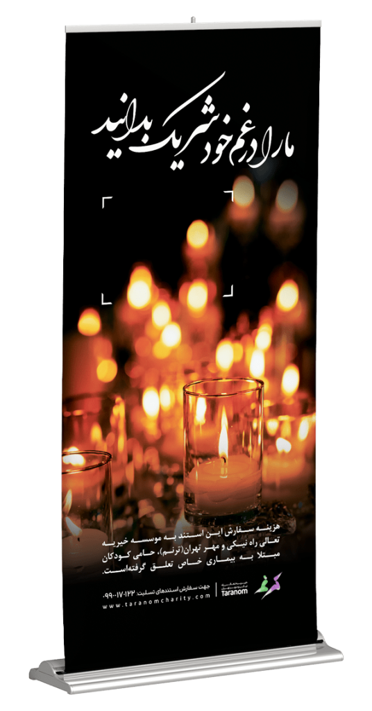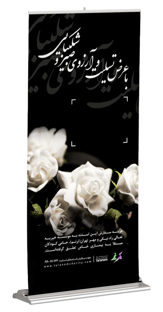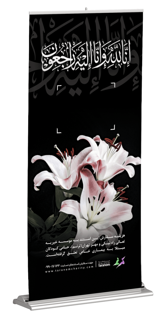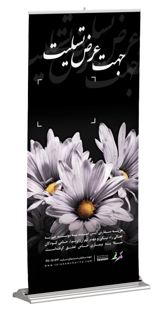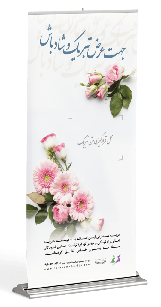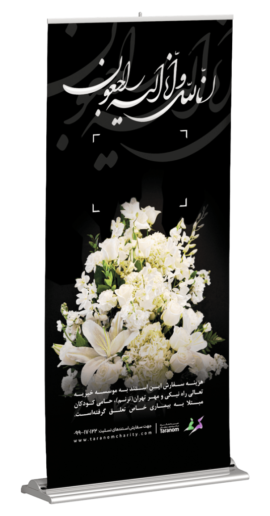سفارش استندهای تبریک و تسلیت مؤسسه خیریه ترنم، راهیست تا در کنار نشان دادن همدلی خود با عزیزانتان، در تأمین هزینههای درمان و بهبود کیفیت زندگی کودکان بیمار نیز سهیم شوید.