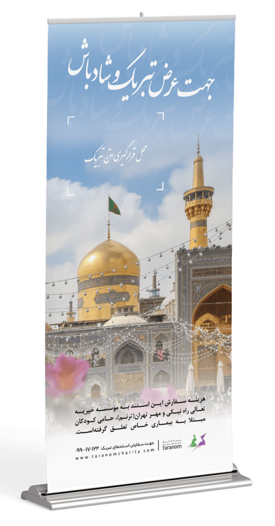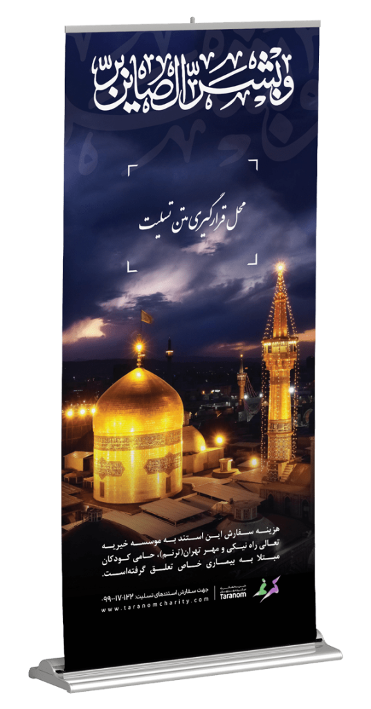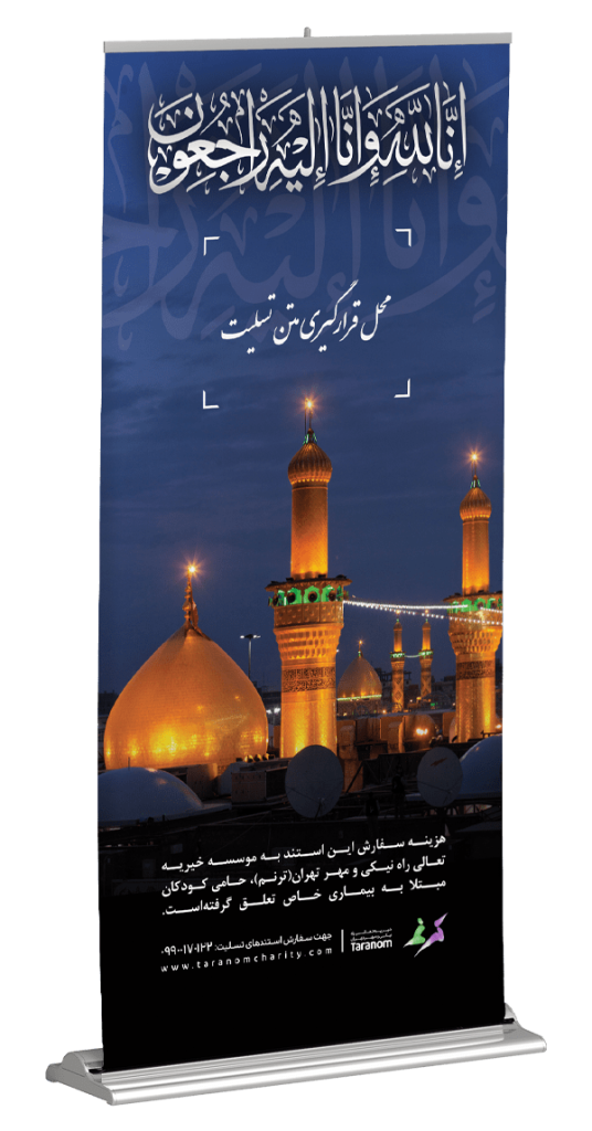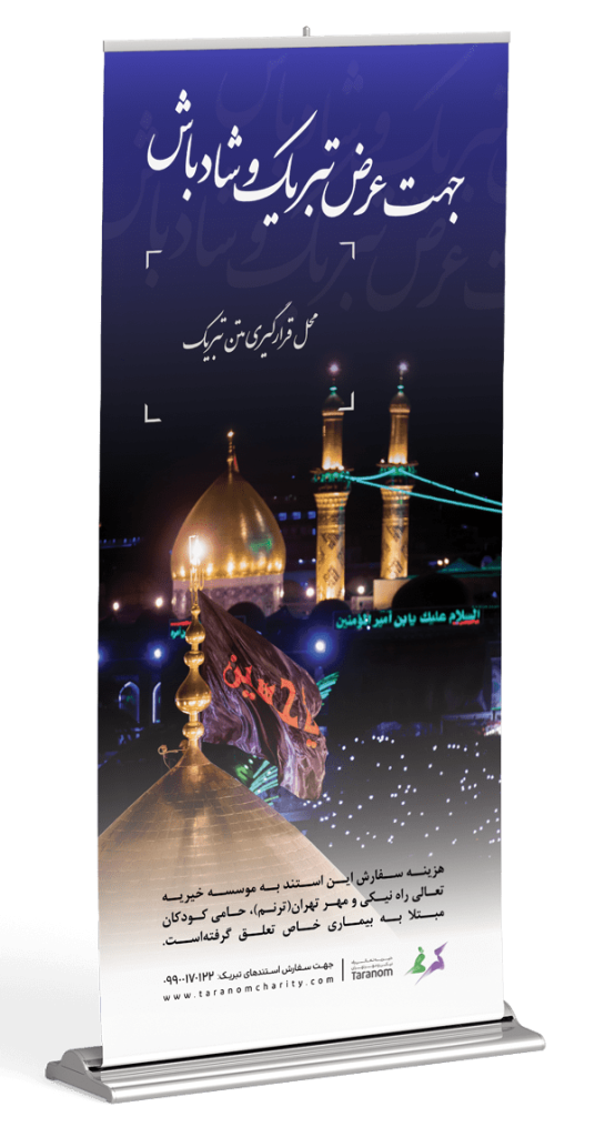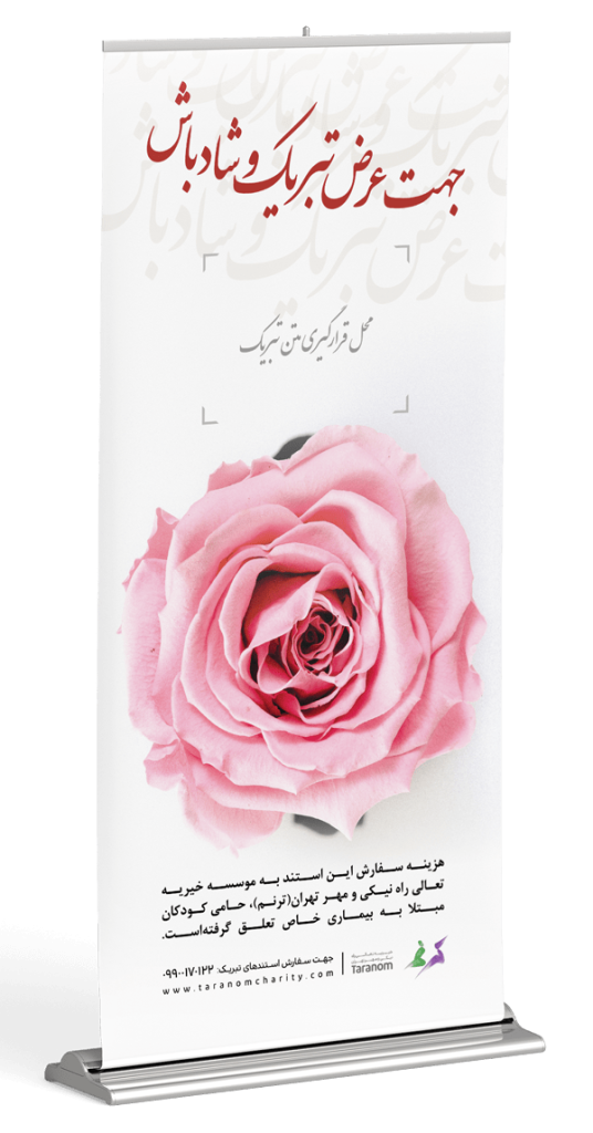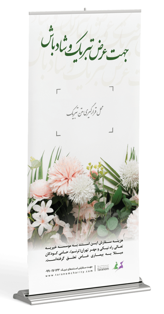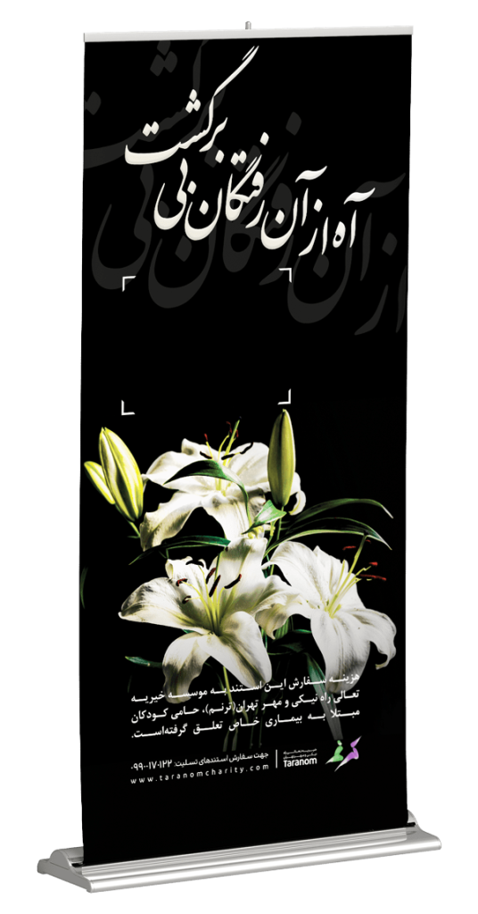 سفارش استندهای تبریک و تسلیت مؤسسه خیریه ترنم، راهیست تا در کنار نشان دادن همدلی خود با عزیزانتان، در تأمین هزینههای درمان و بهبود کیفیت زندگی کودکان بیمار نیز سهیم شوید.